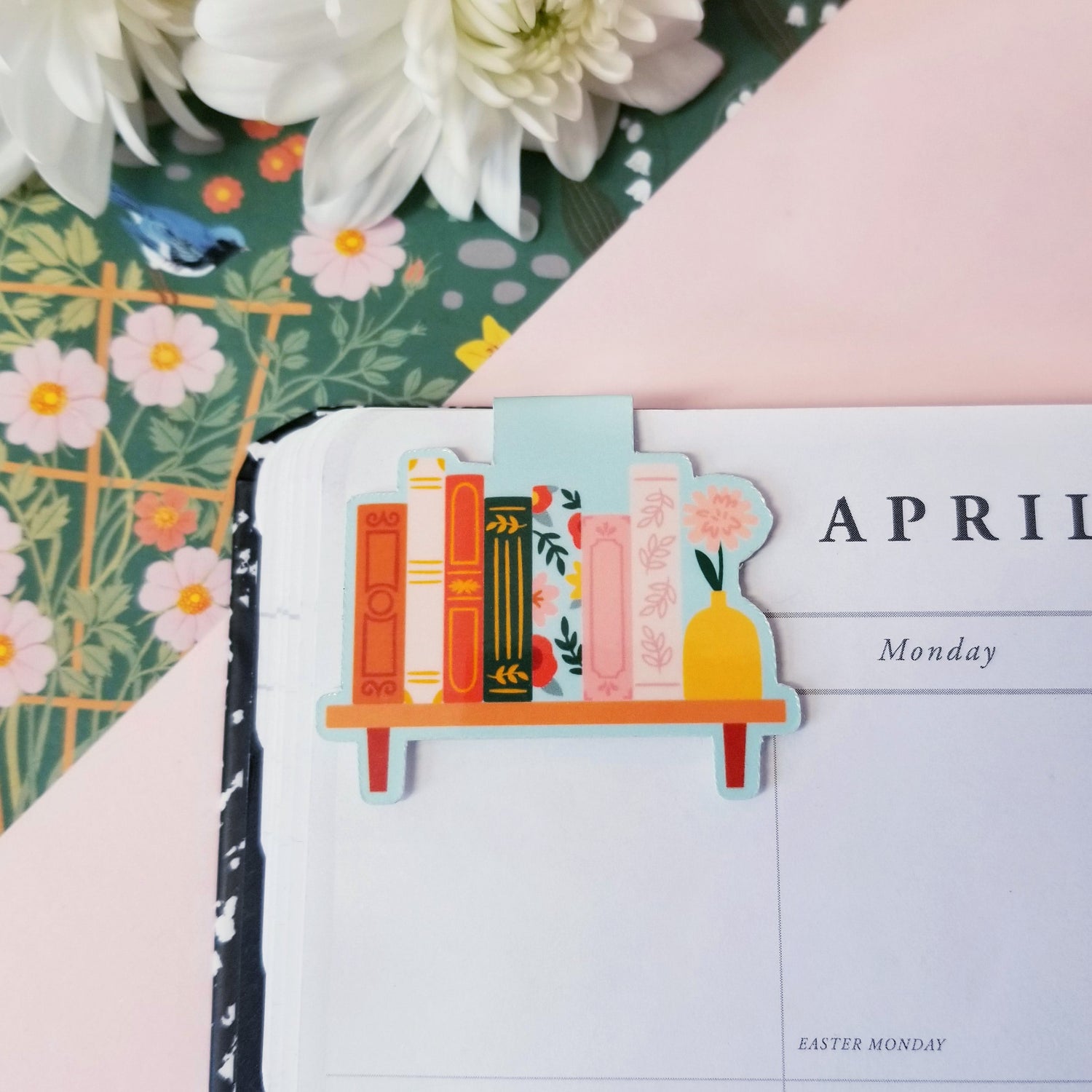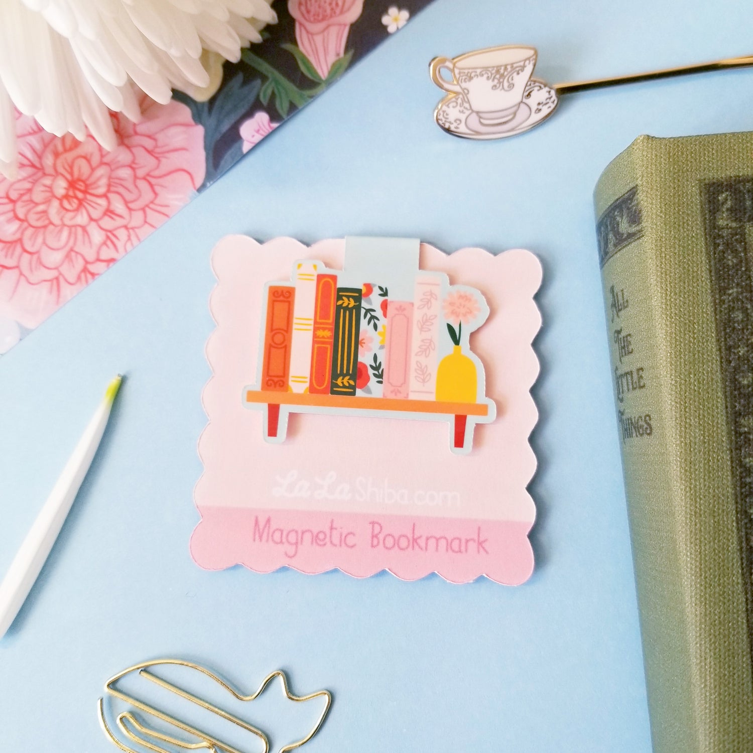 Start your next chapter with this little shelf magnetic bookmark. It makes a cute gift for reading and stationary lovers. It measures 1.75" by 1.75" when folded. It has a glossy laminate finish and features a strong magnet for closure.