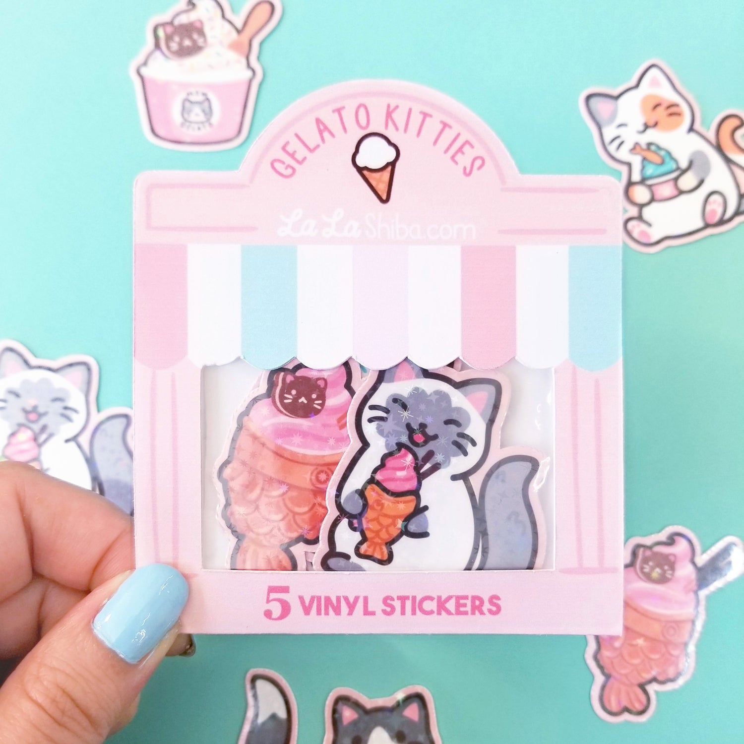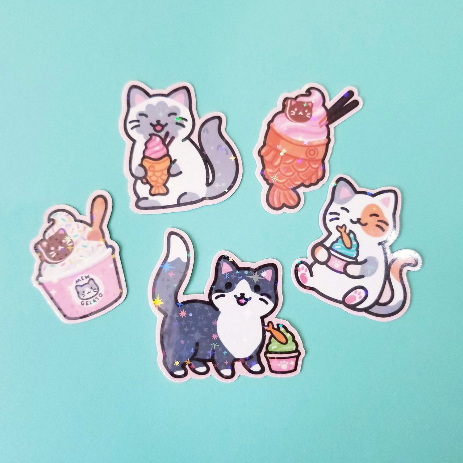 Add a sprinkle of sweetness to your day with our Kawaii Kitties & Gelato sticker pack! This adorable set includes 5 holographic laminated stickers featuring cute cats and their favorite frozen treats.