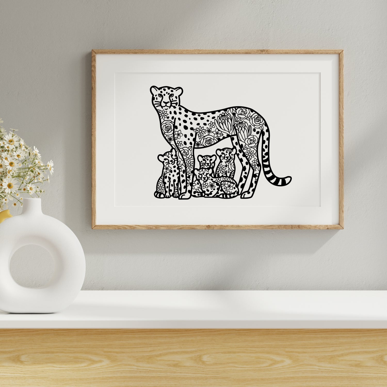 Mother Cheetah and cubs – Floral Design | Printable Wall Art | Digital Download (PDF, SVG, PNG)